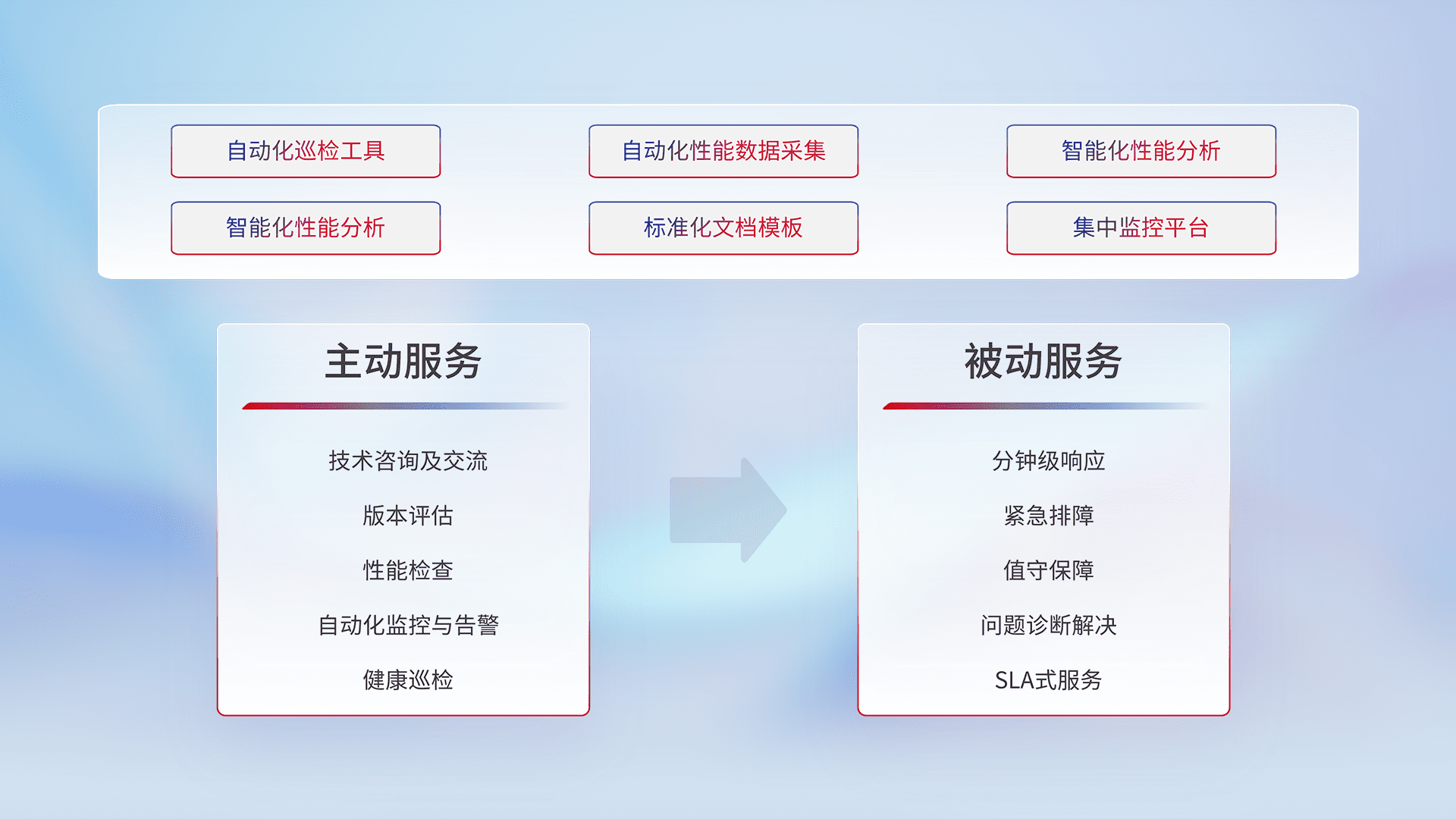 智能化工具和标准化文档,,保障服务质量,,,提供主动服务(包含技术咨询、、、版本评估、、性能检查、、、、自动化监控与告警、、、健康巡检)和被动服务包含(分钟级响应、、、紧急排障、、、值守保障、、、问题诊断解决、、SLA服务)。。。